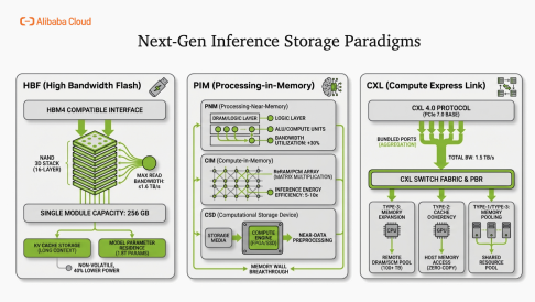 ● PIM(Processing-in-Memory)存内计算。 在存储芯片内部嵌入轻量级计算单元,实现"计算向数据移动"。范式转变:传统模式是把原始 tensor 数据从存储搬到 GPU 进行计算,容易遇到网络带宽瓶颈;新模式是在存储端直接完成 attention 分数等关键计算,只将最终的小结果通过网络传输。核心价值:大幅减少数据搬运量,从根源上突破"内存墙"限制。