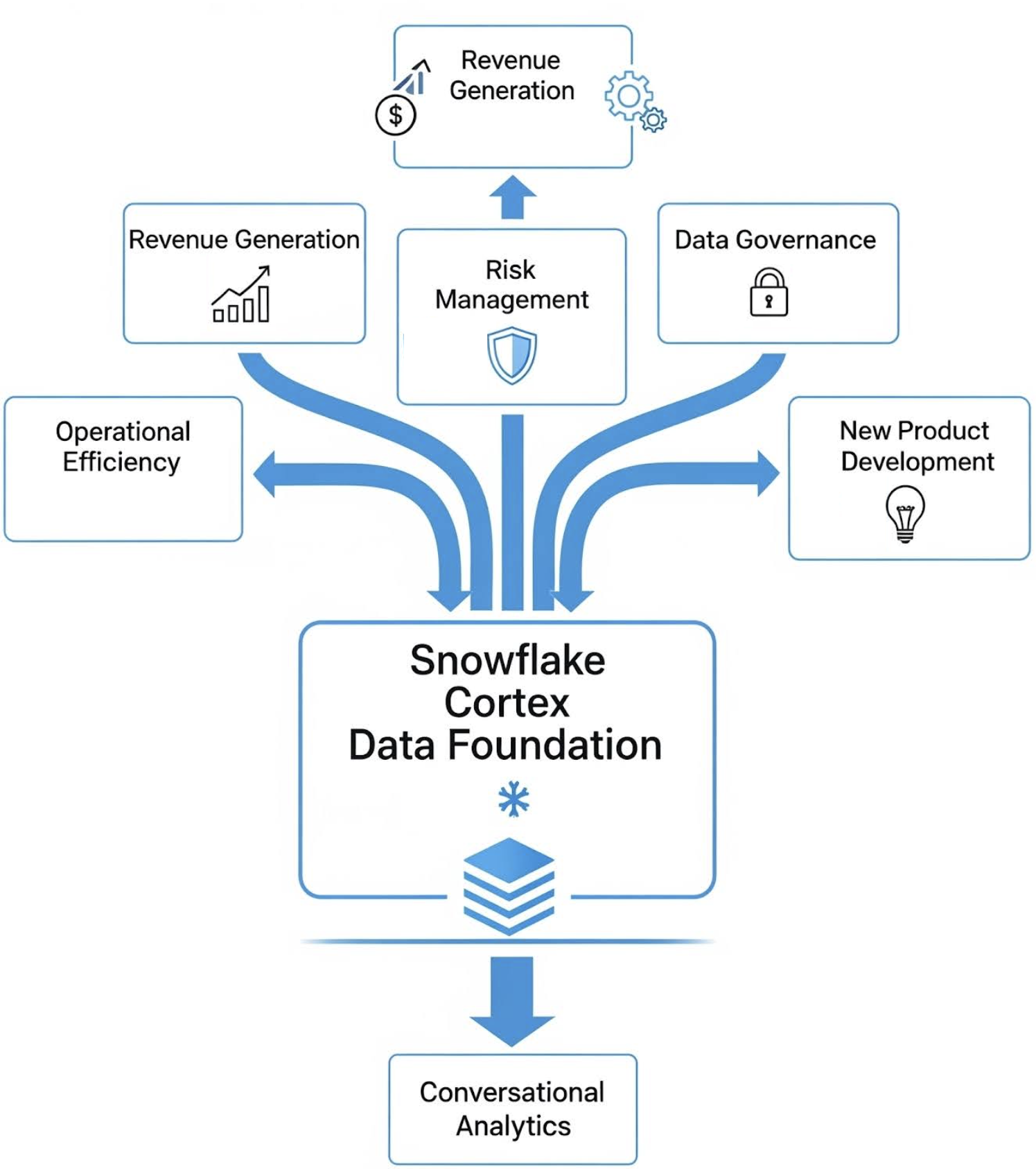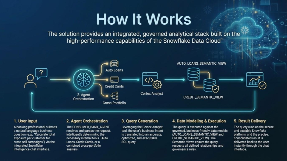 本方案开创了一种全新模式,助力零售银行充分挖掘其核心资产——数据的价值。该架构基于 Snowflake 数据云构建,展示了如何通过由统一数据平台与严谨语义视图驱动的 Snowflake Cortex 智能体,在汽车贷款与信用卡两大业务条线之间实现复杂的对话式分析。